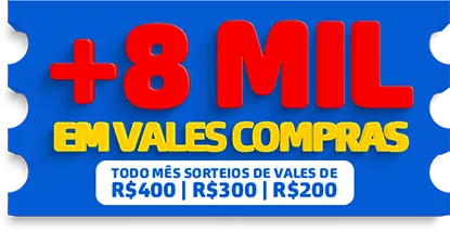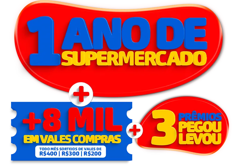 O sorteio principal será de 1 ano de supermercado GRÁTIS! (12 vales de R$ 1.000,00, entregues mensalmente)